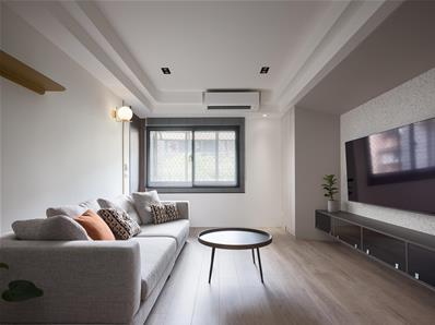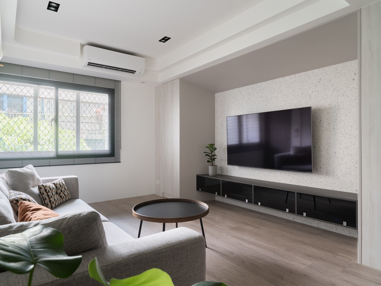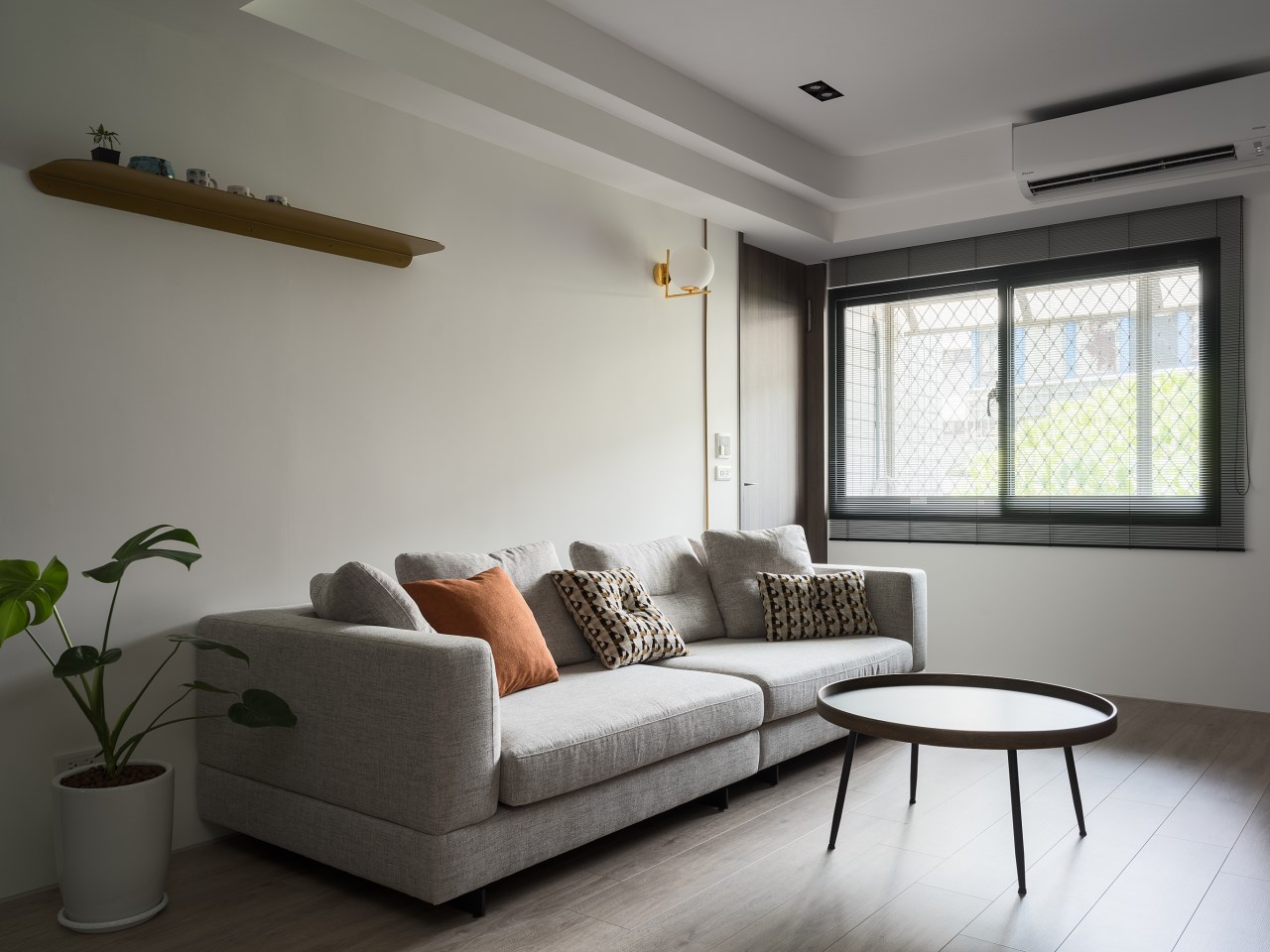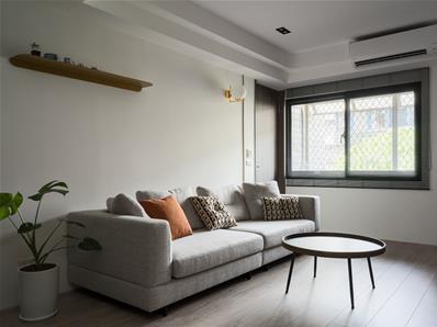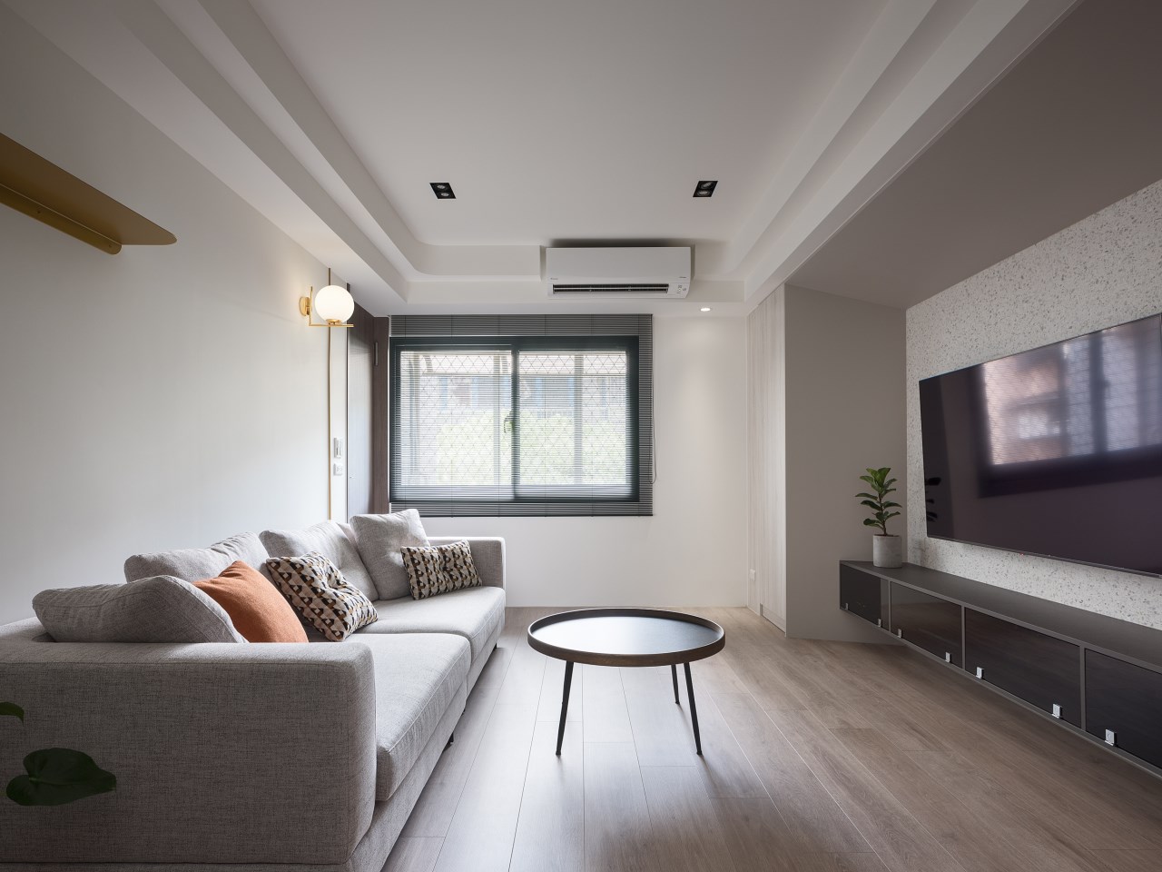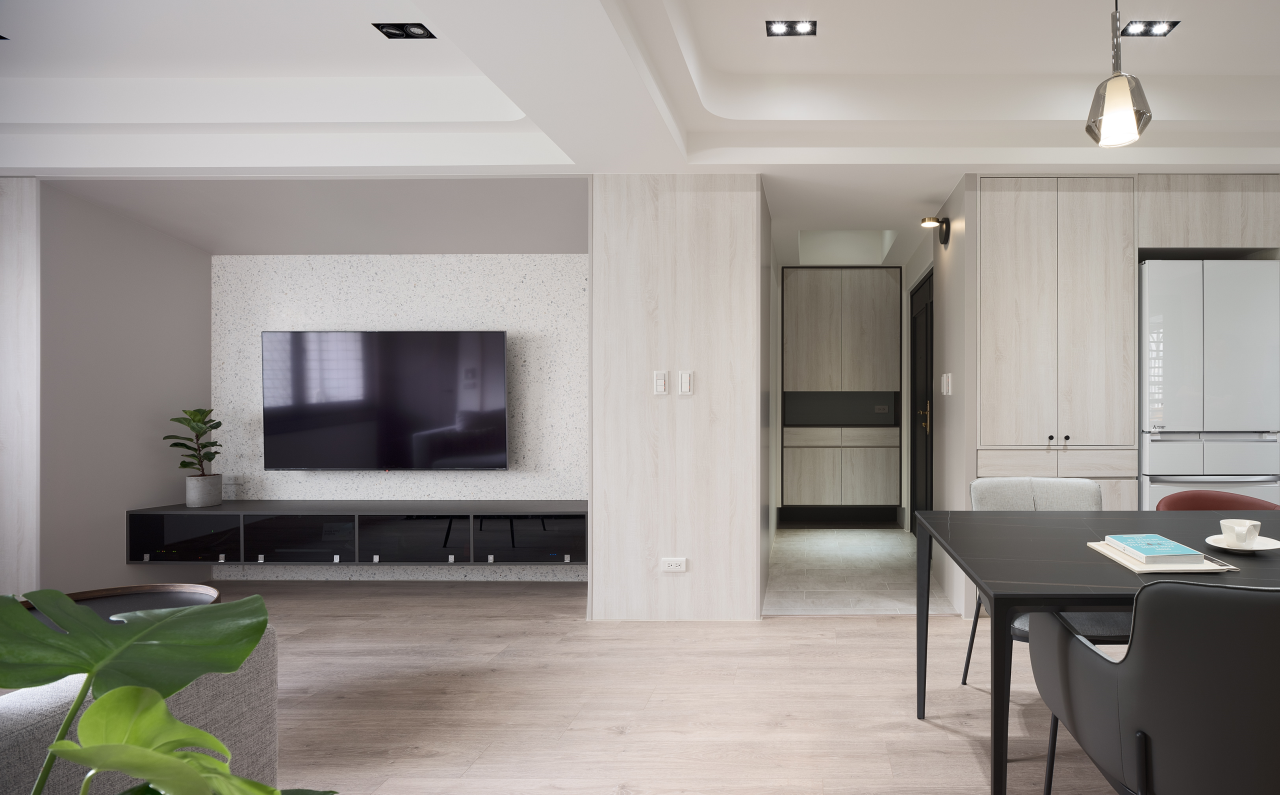 空間坪數 | 20 坪 空間格局 | 玄關、 客廳、開放式餐廚區、 主臥、 主浴、 次臥、 客用衛浴 主要材料 | 水磨石、 壁紙、 美耐板、 超耐磨木地板、 得利乳膠漆跳色、 系統櫃、 進口磁磚、 鐵件