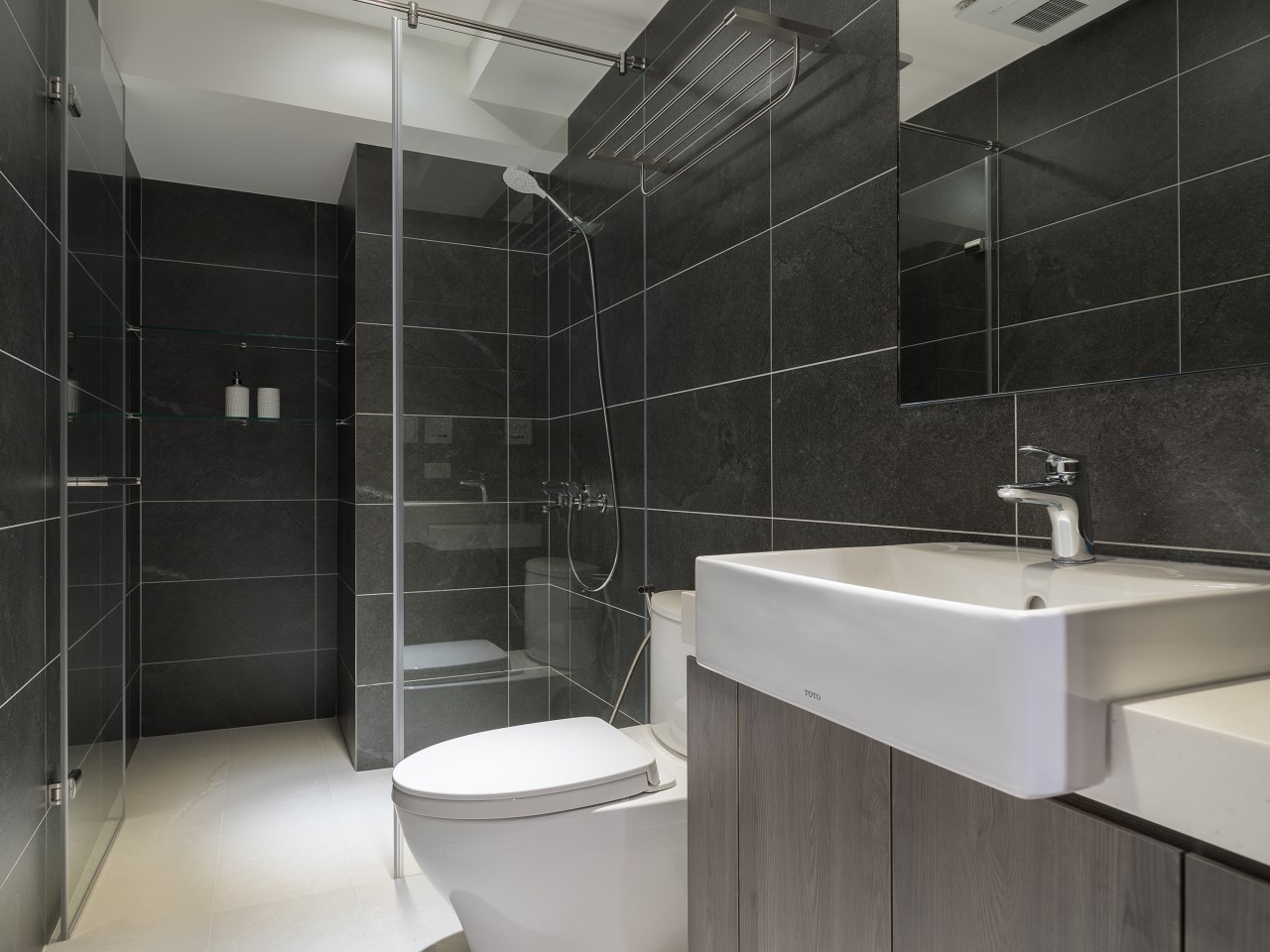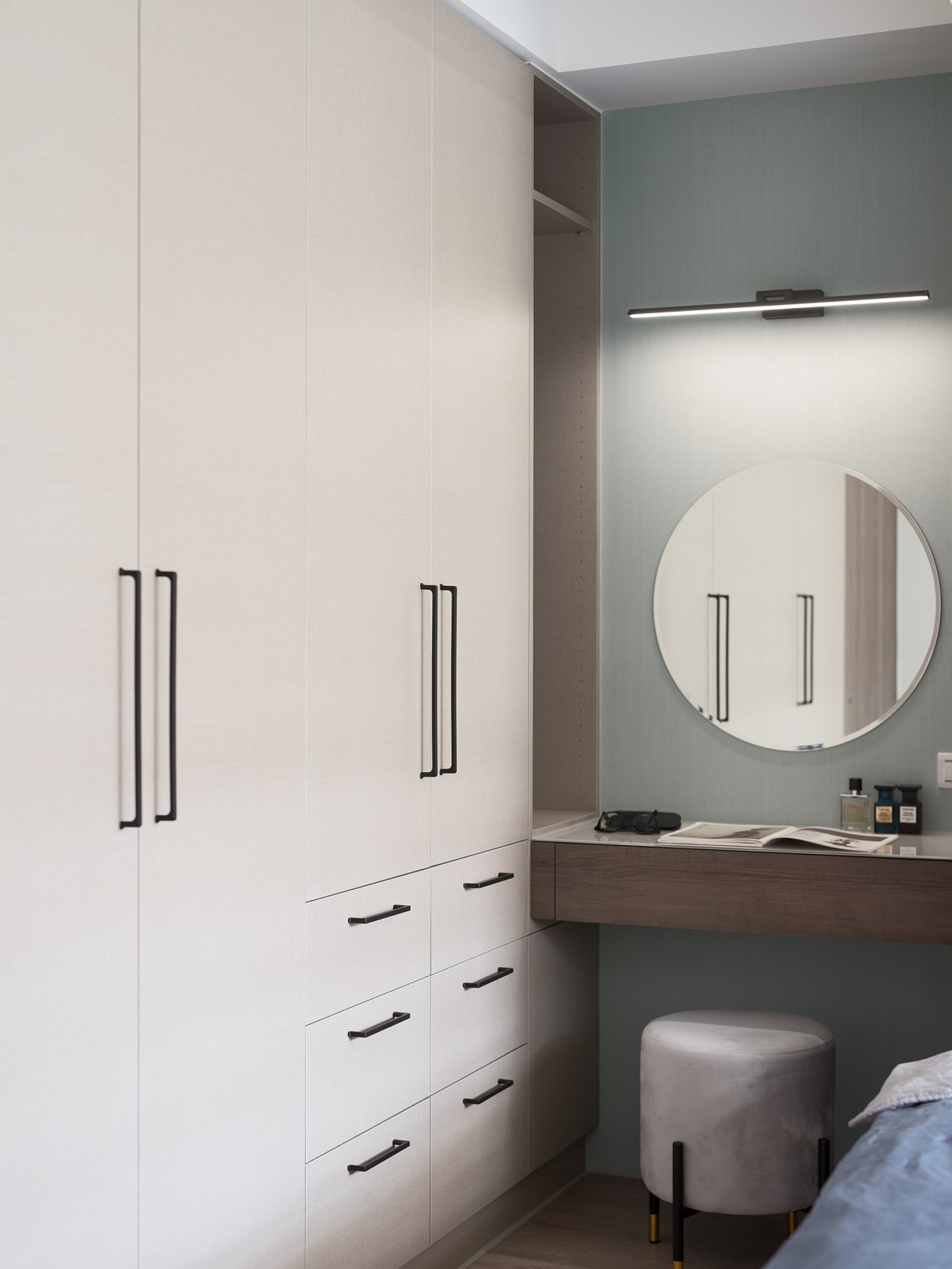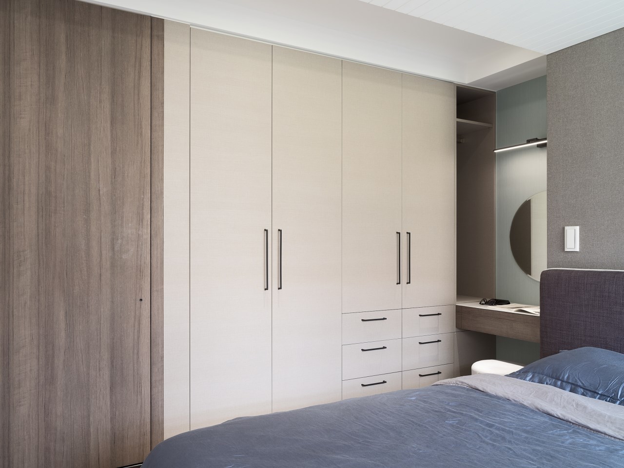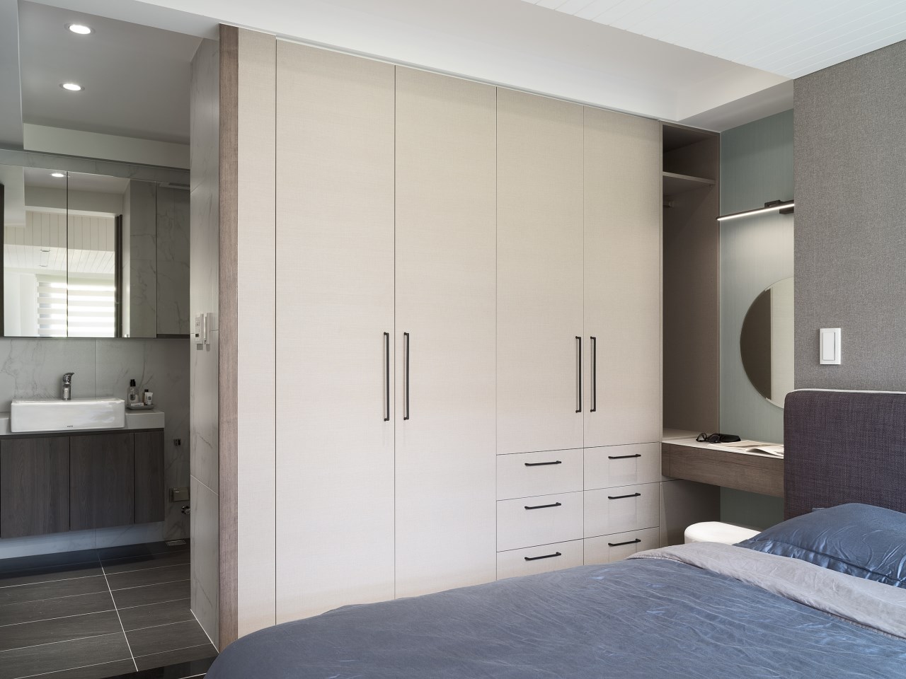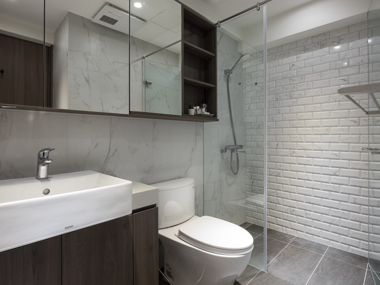 空間坪數 | 20 坪 空間格局 | 玄關、 客廳、開放式餐廚區、 主臥、 主浴、 次臥、 客用衛浴 主要材料 | 水磨石、 壁紙、 美耐板、 超耐磨木地板、 得利乳膠漆跳色、 系統櫃、 進口磁磚、 鐵件