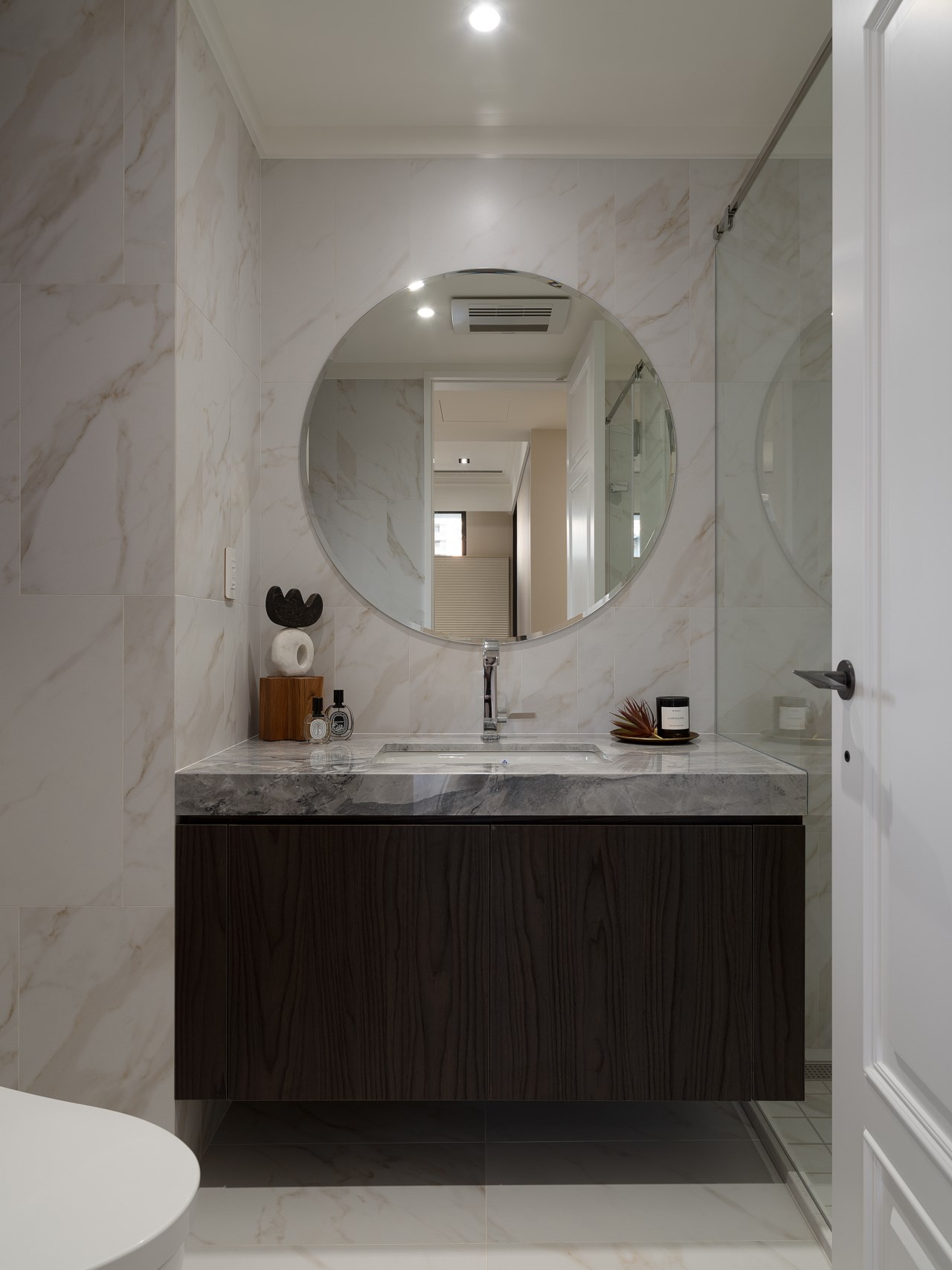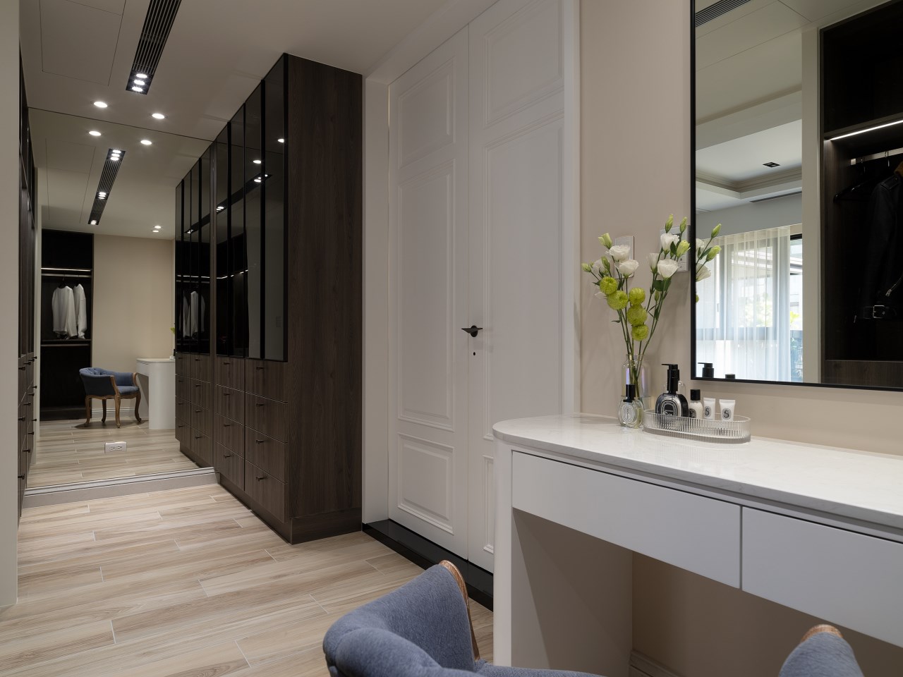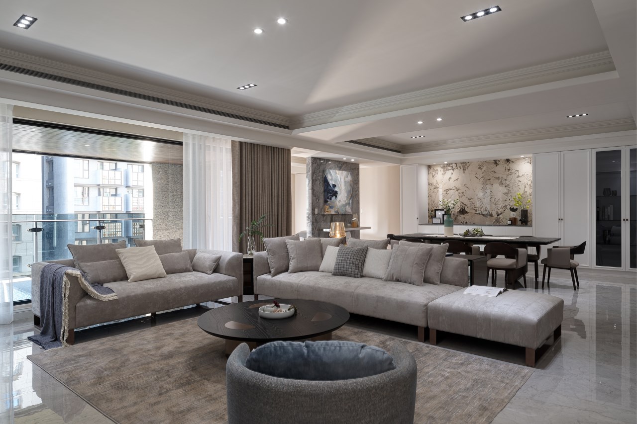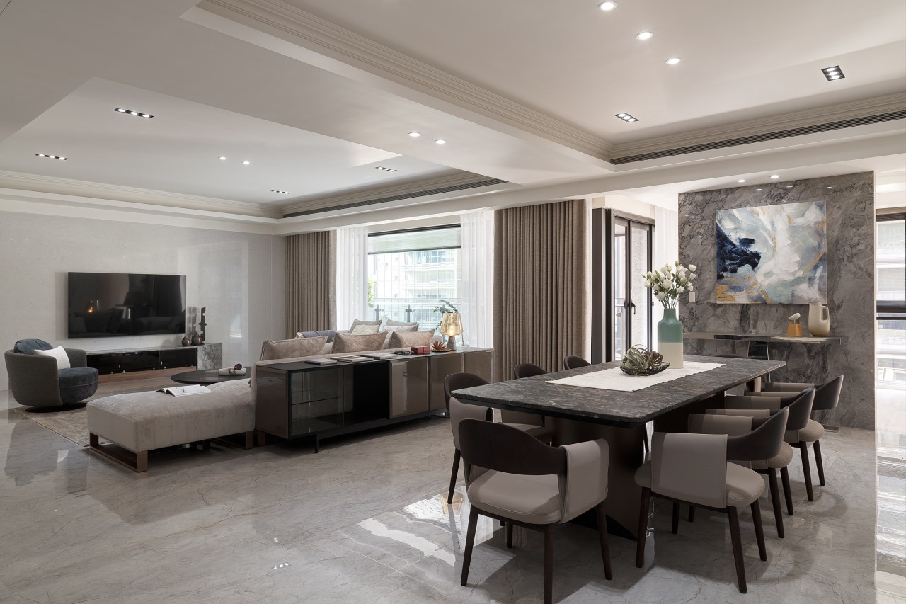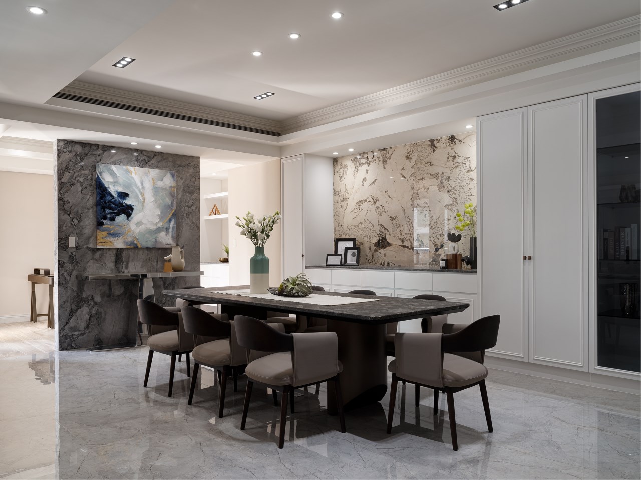 空間坪數 | 75 坪 空間格局 | 客廳、 餐廳、 廚房、 書房、 主臥、 主臥更衣室、 主浴、 客用衛浴、長親房及衛浴、 小孩房及衛浴 主要材料 | 大理石、 磁磚、 線板、 木作烤漆、 木皮、 系統櫃、 進口壁紙