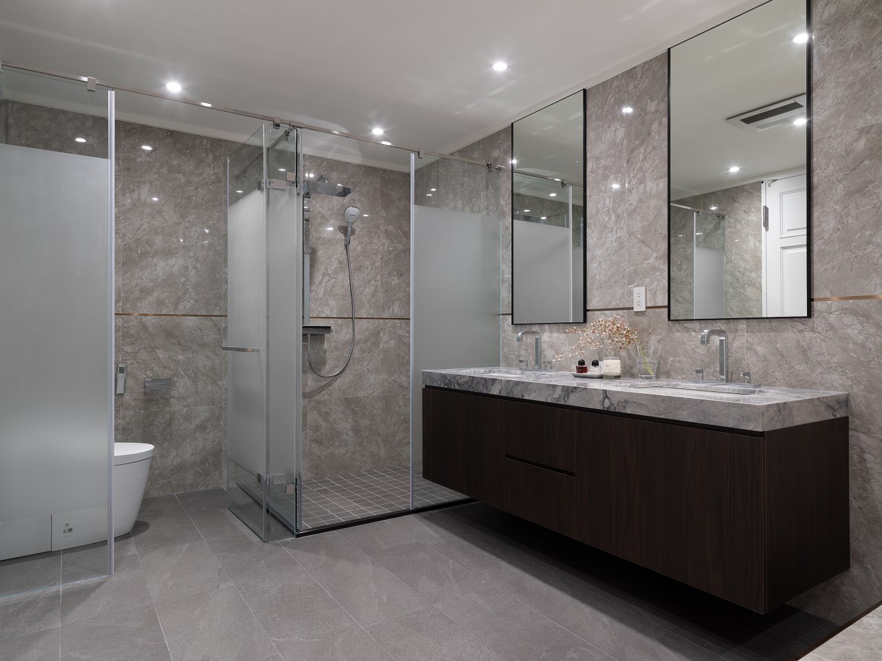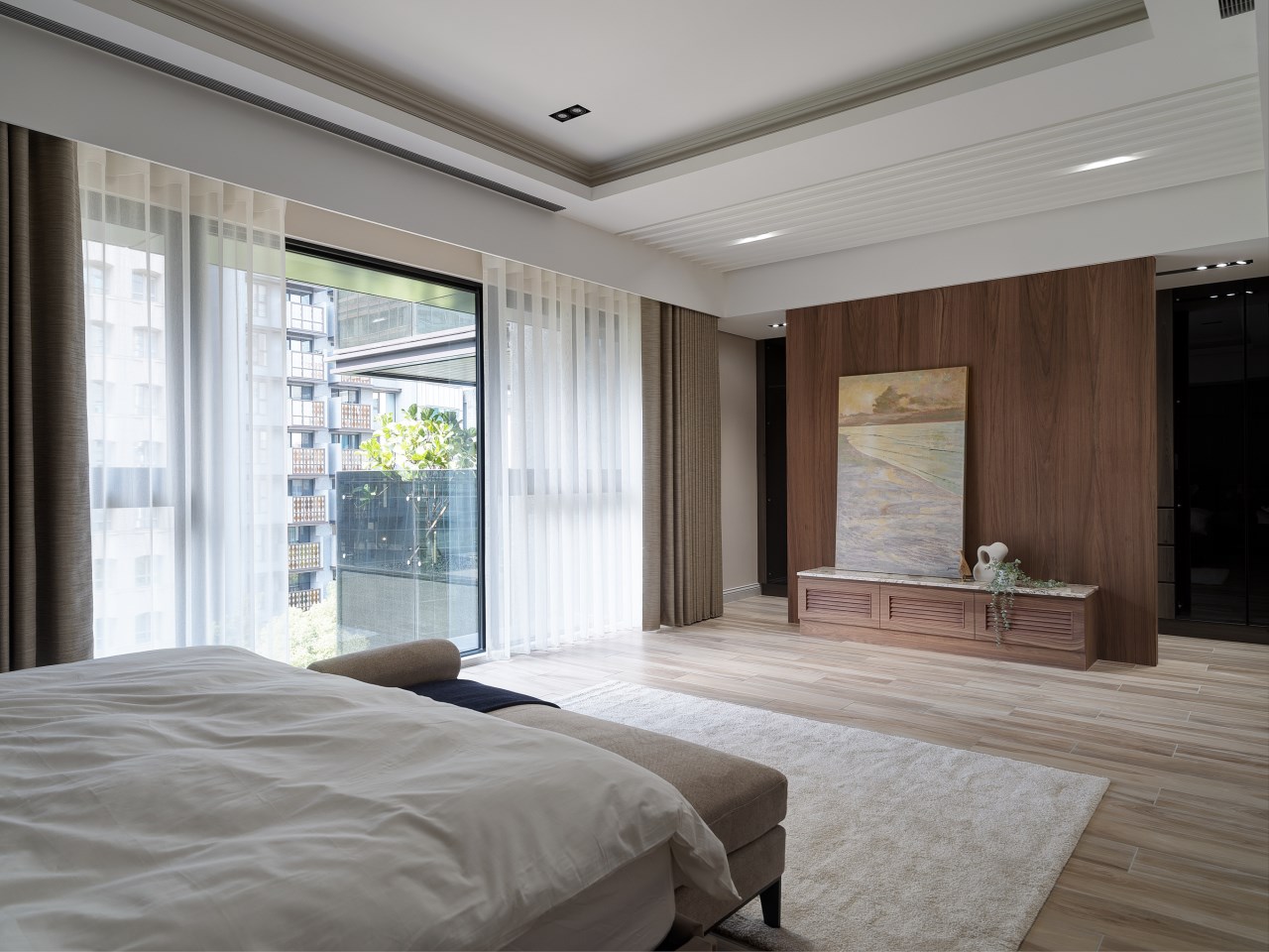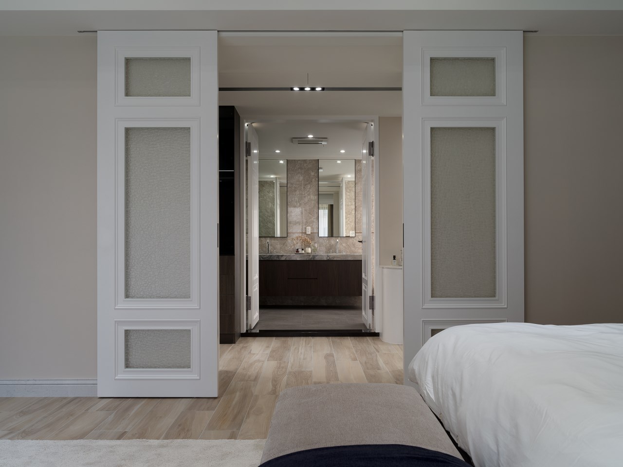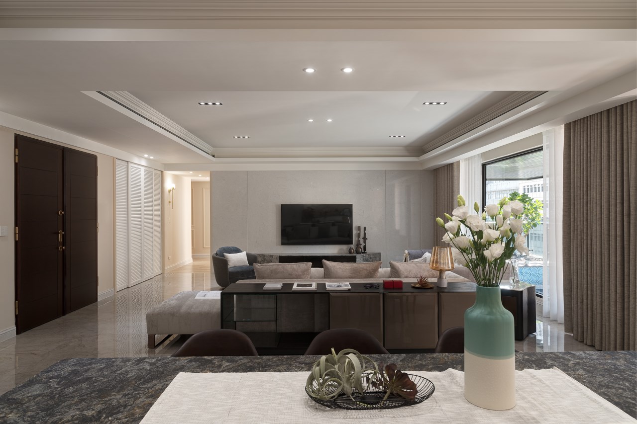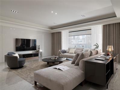空間坪數 | 75 坪 空間格局 | 客廳、 餐廳、 廚房、 書房、 主臥、 主臥更衣室、 主浴、 客用衛浴、長親房及衛浴、 小孩房及衛浴 主要材料 | 大理石、 磁磚、 線板、 木作烤漆、 木皮、 系統櫃、 進口壁紙