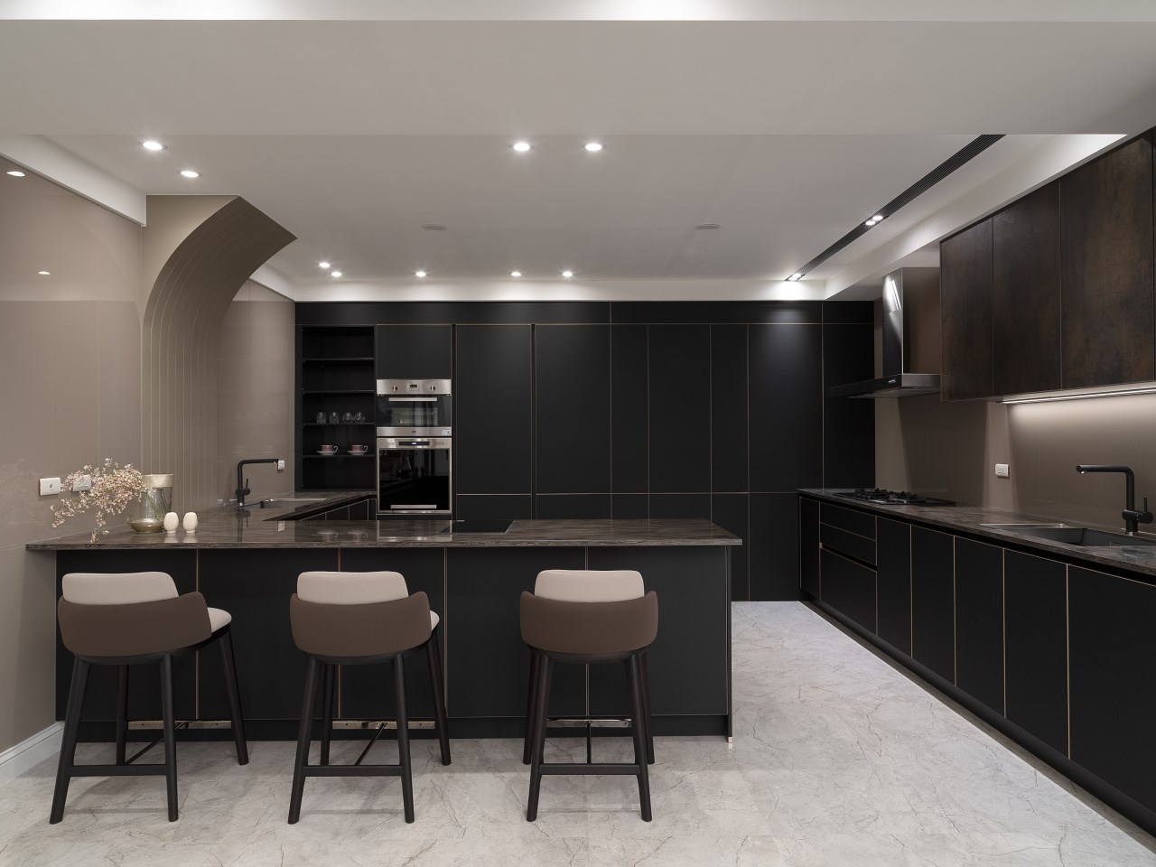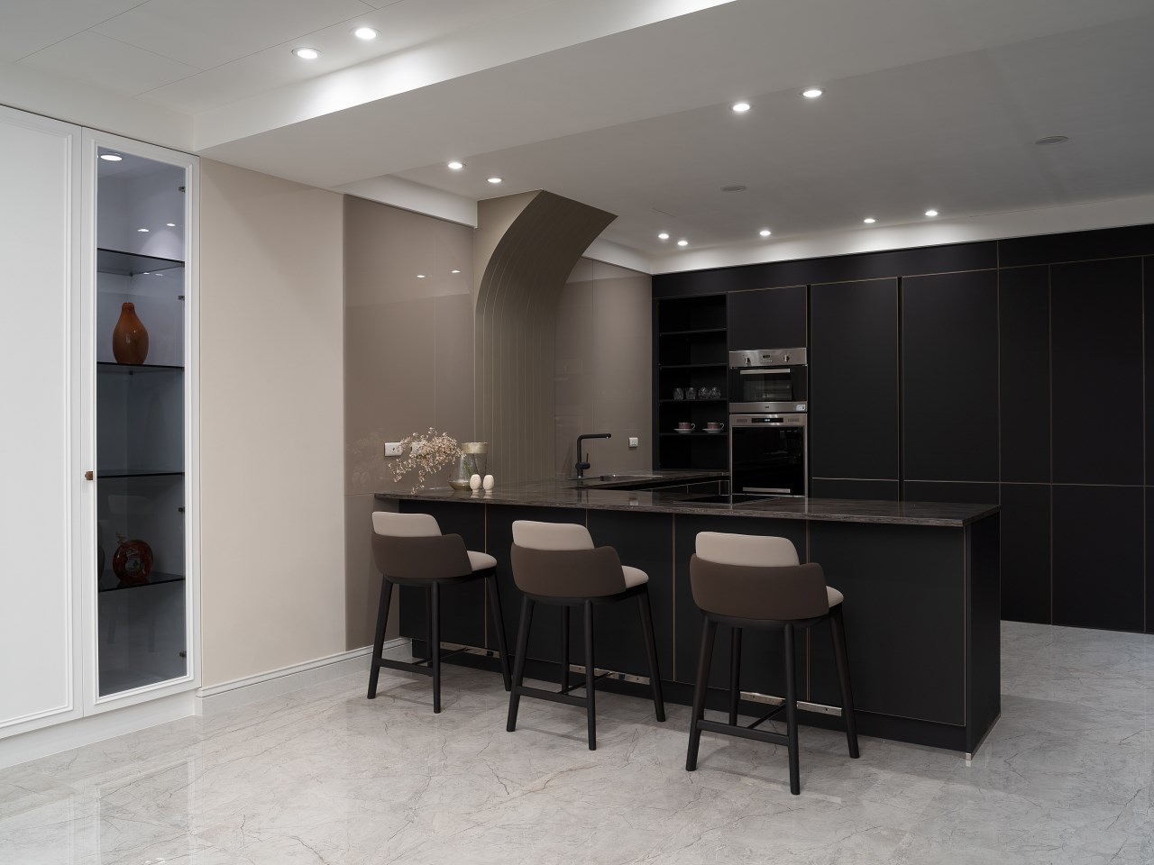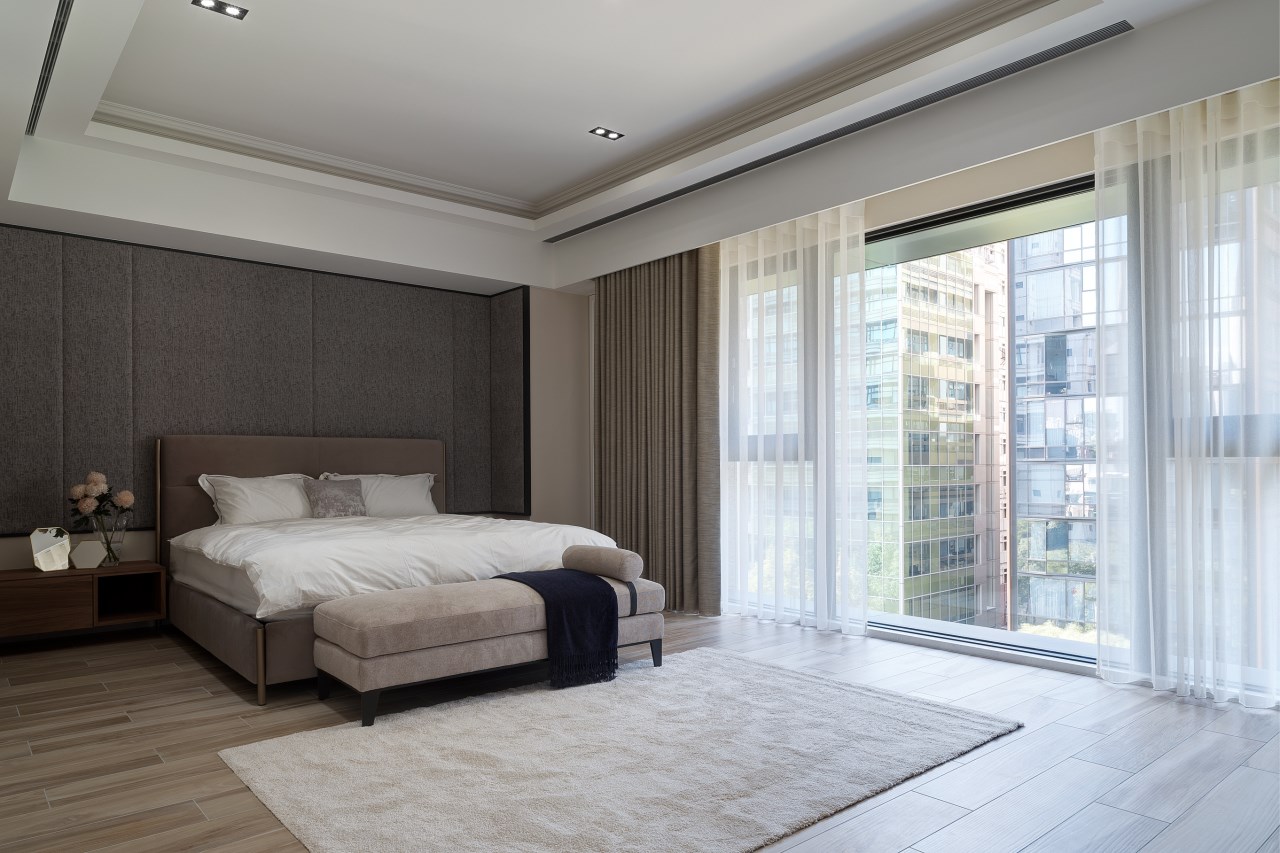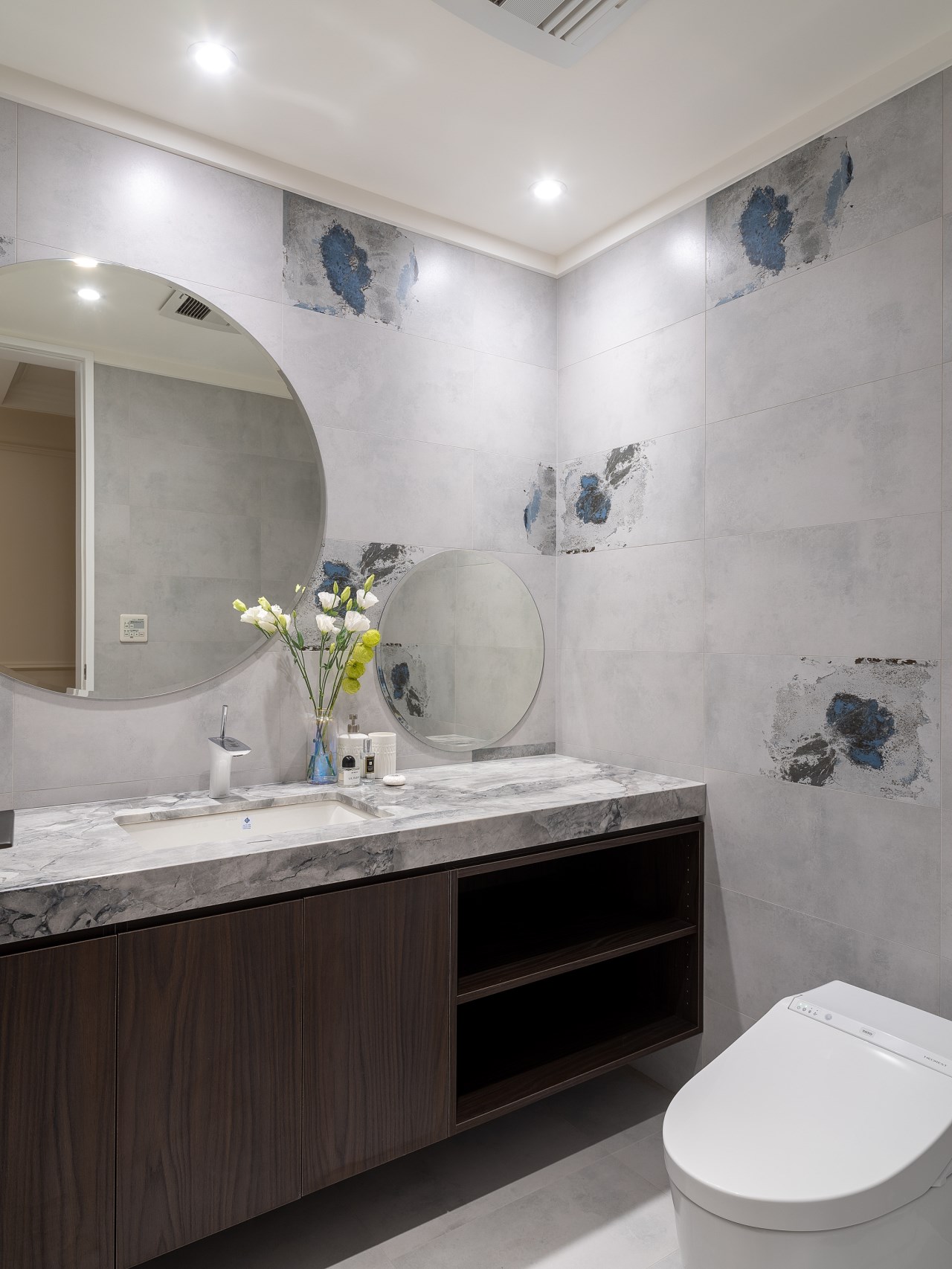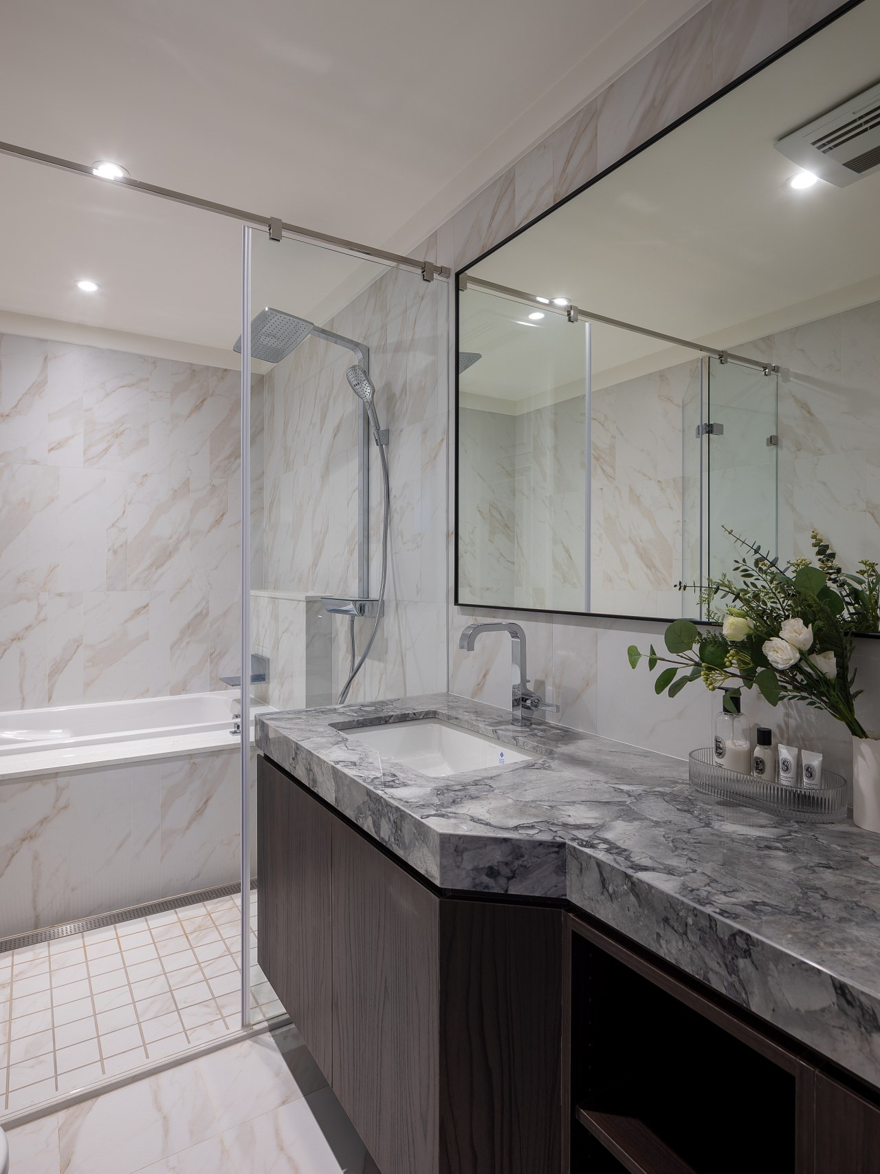 空間坪數 | 75 坪 空間格局 | 客廳、 餐廳、 廚房、 書房、 主臥、 主臥更衣室、 主浴、 客用衛浴、長親房及衛浴、 小孩房及衛浴 主要材料 | 大理石、 磁磚、 線板、 木作烤漆、 木皮、 系統櫃、 進口壁紙