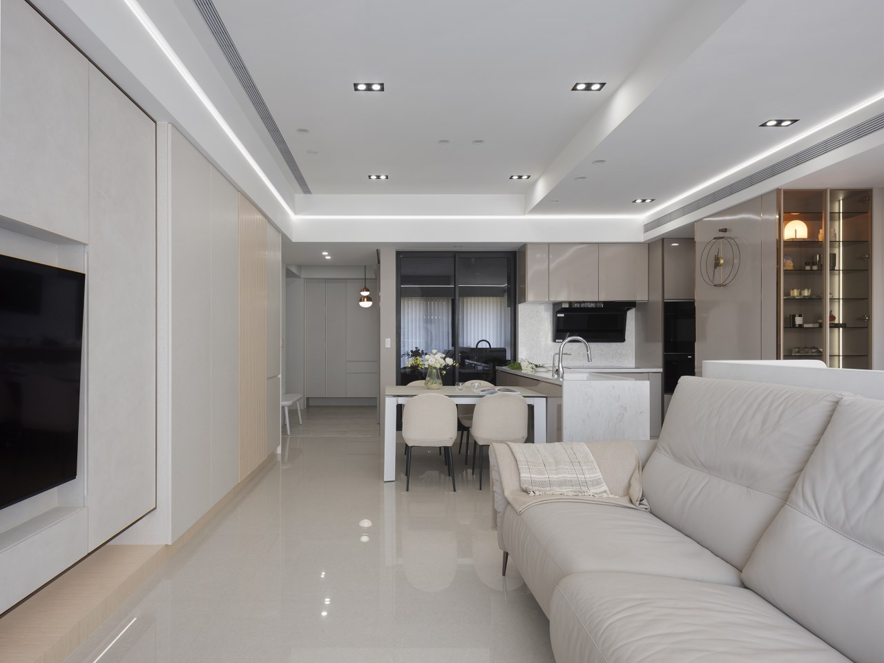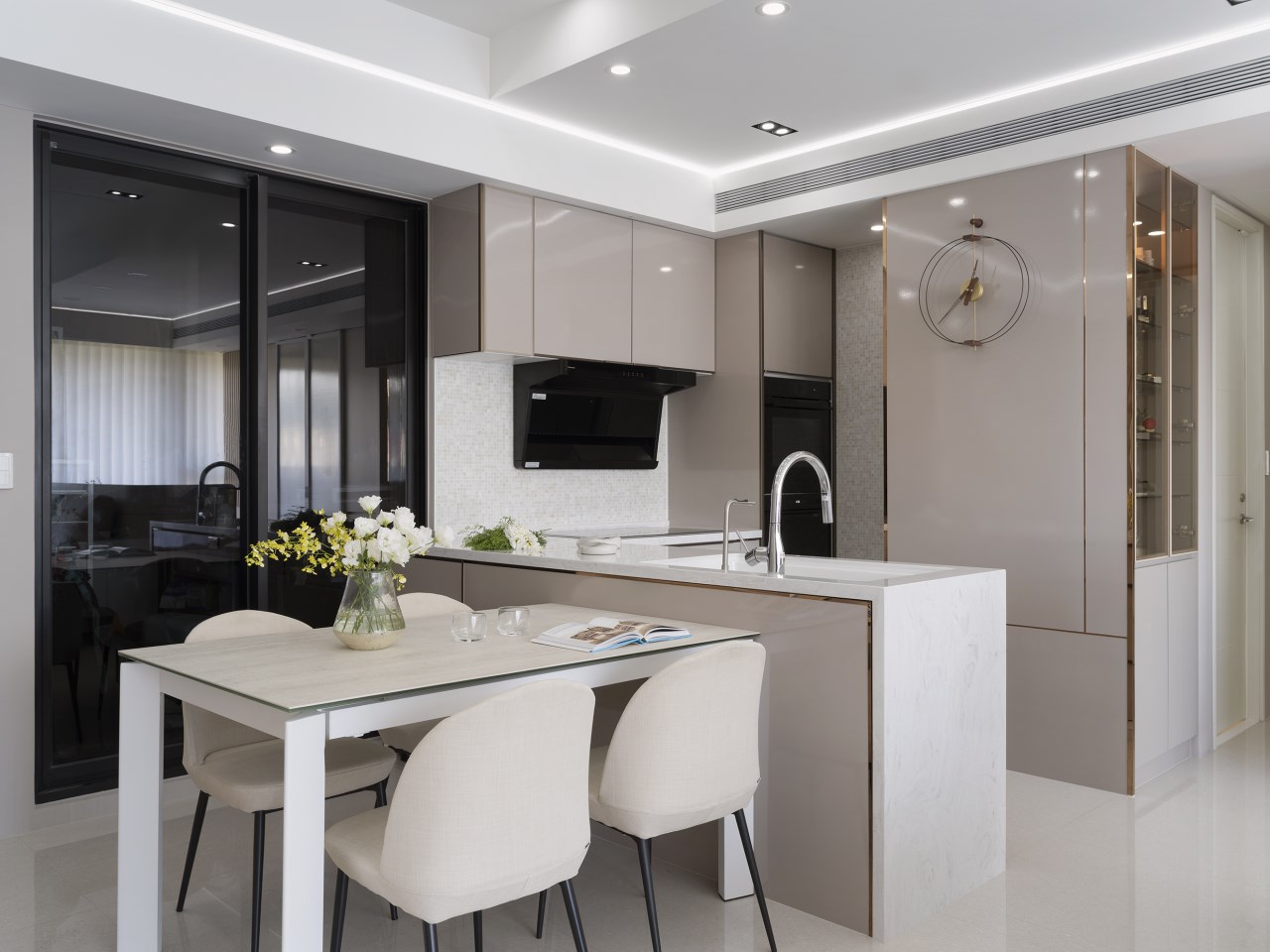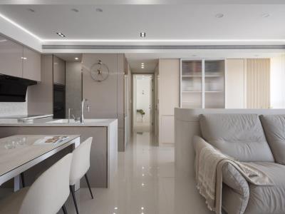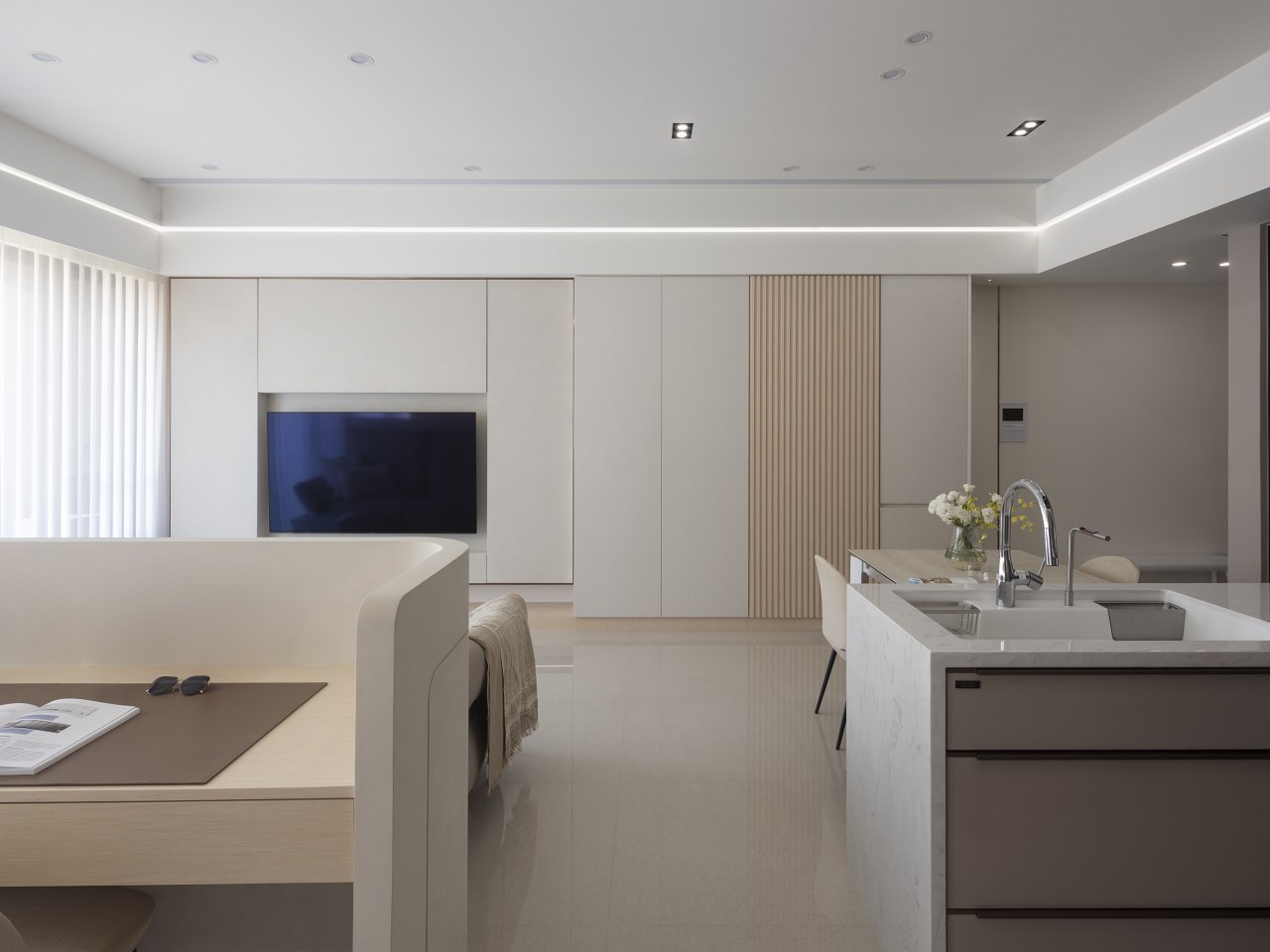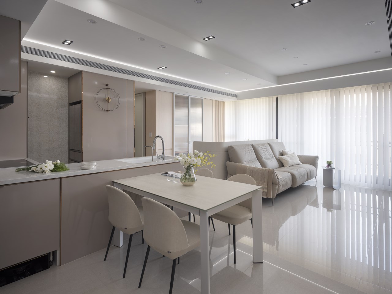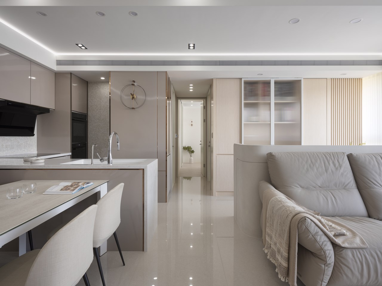 空間坪數 | 25 坪 空間格局 | 玄關、 客廳、 餐廳、 廚房、 開放式書房、 主臥、 主臥更衣室、 主浴、 小孩房、 客用衛浴 主要材料 | 磁磚、 木地板、 木作實木貼皮、 系統櫃、 烤漆、 特殊漆、 人造石、 琺瑯板、 金屬及玻璃類材